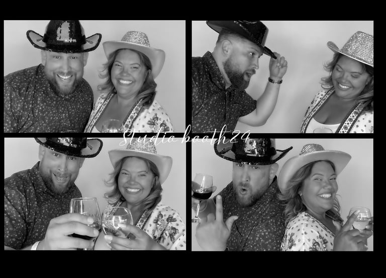 Our Glam booth aesthetic features timeless black-and-white photographs perfect for capturing a moment. Ideal for weddings and special occasions.
